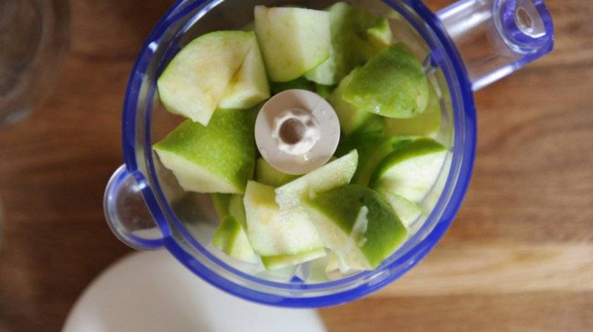Свежие (лучше домашние) яблоки помойте, очистите от сердцевин, плодоножек и всех подпорченных участков. Нарежьте мякоть таким образом, чтобы кусочки легко входили в горлышко соковыжималки.
