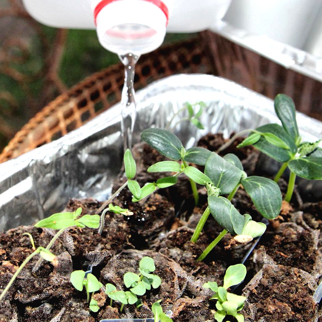 Посадочный ком в земле с огуречной рассадой в фазе 1-2 настоящих листьев проливают питательным раствором за 30-40 минут до высадки растений на постоянное место (грядки, парник, теплица) или опрыскивают сеянцы жидкостью из пульверизатора за сутки переноса на грядки.