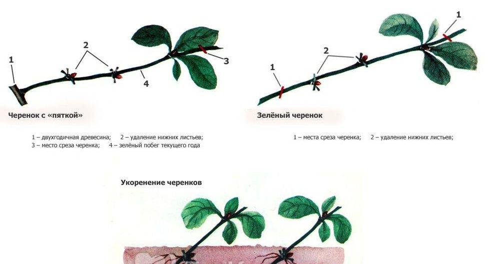 Для размножения этим способом можно использовать как верхушку, так и целый стебель. Для укоренения рекомендуется подбирать участки с рыхлой почвой на теневом участке. Черенок укореняют в землю и накрывают пленкой. Строгих временных границ нет. Процедуру можно проводить на протяжении всего лета.