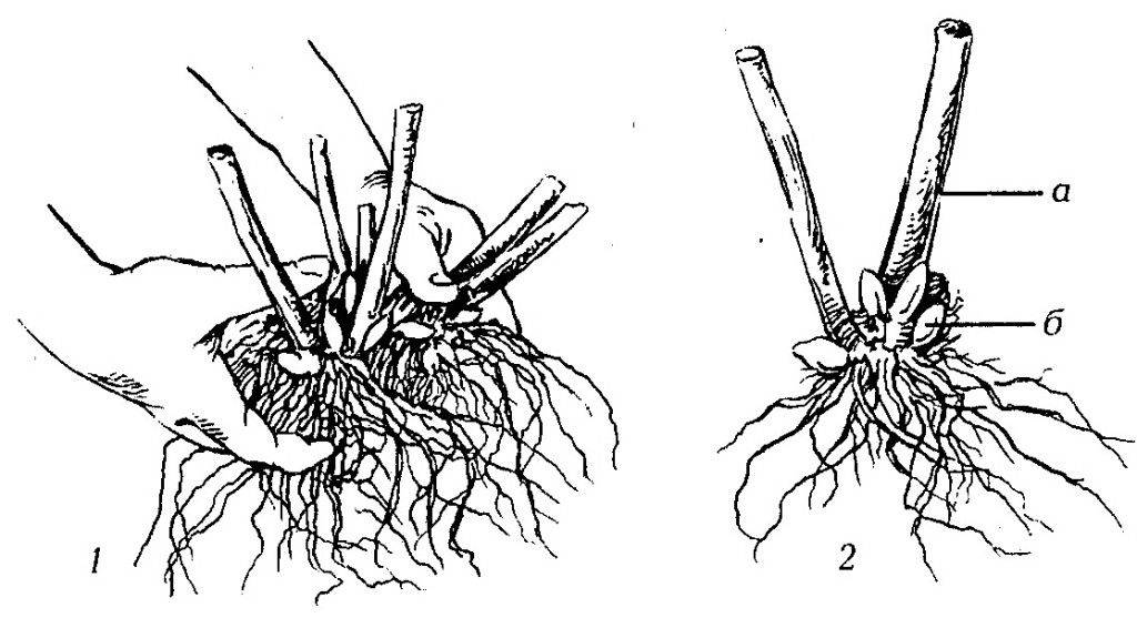 Для размножения данным способом рекомендуется дождаться периода, когда цветок вырастет на 3-5 см от земли. Далее кустик разделяют на мелкие части с 2-3 почками и сажают. Уже на следующий год деленки образуют полноценное растение. Деление лучше проводить каждые 3-4 года. Это способствует омоложению корневой системы, а также предотвращает развитие грибка.