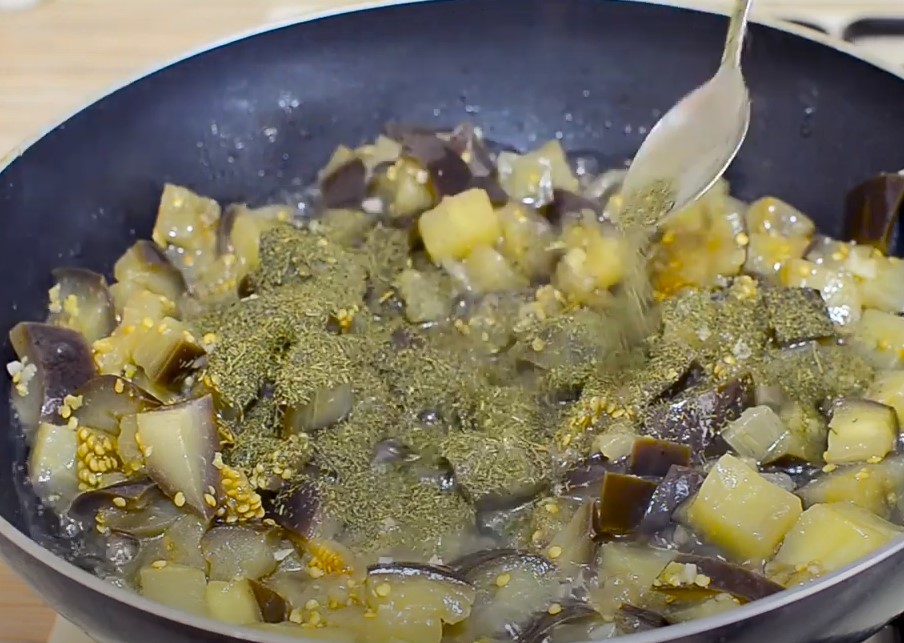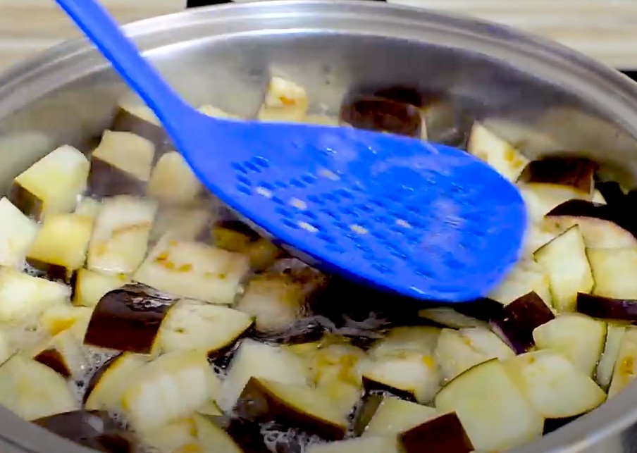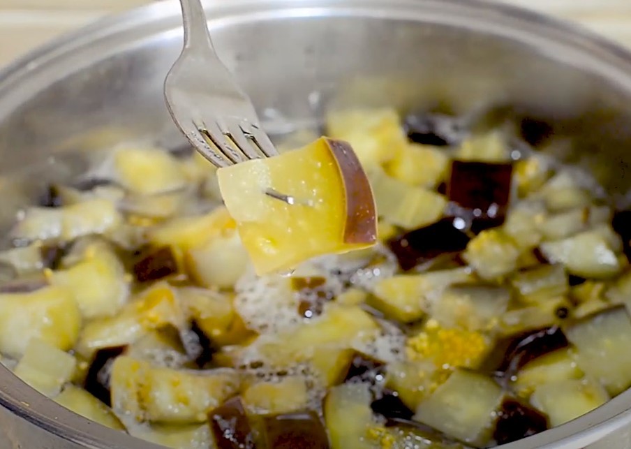 4. Поскольку баклажаны очень нежные и легкие, они всегда при варке начинают всплывать, поэтому вы иногда придавливайте их лопаточкой.