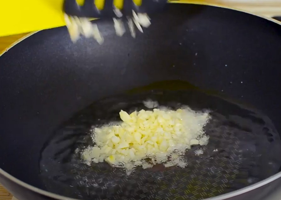 7. И сразу же отправьте его к вареным баклажанам, а следом за ним, выдавленный через чеснокодавилку чеснок.