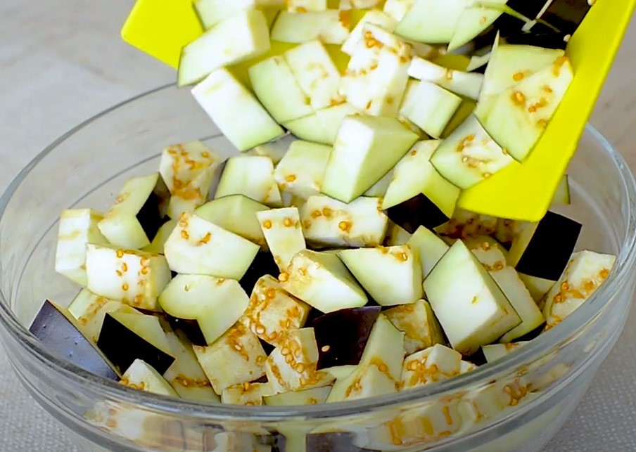 - Устраняйте характерную горечь. Синенькие обладают специфической горечью. Чтобы устранить ее, вымытые плоды нарежьте некрупными кружками или кубиками. Сырье сложите в миску, посолите. Спустя 15-20 минут на поверхности кусков выступят капли жидкости. Аккуратно промойте кубики под проточной водой, промокните бумажным полотенцем.