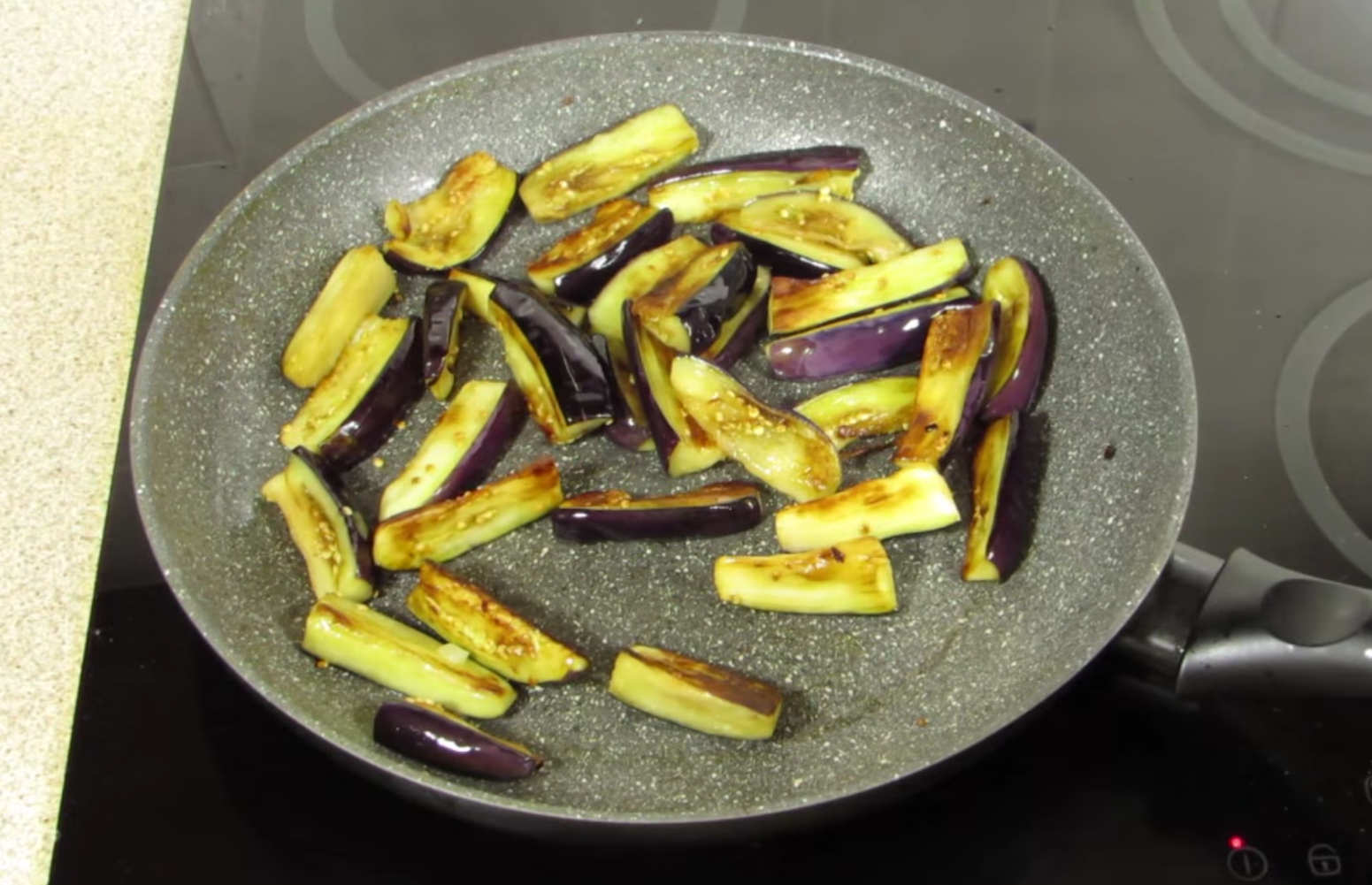 - На раскаленном масле обжарьте слайсы баклажанов.