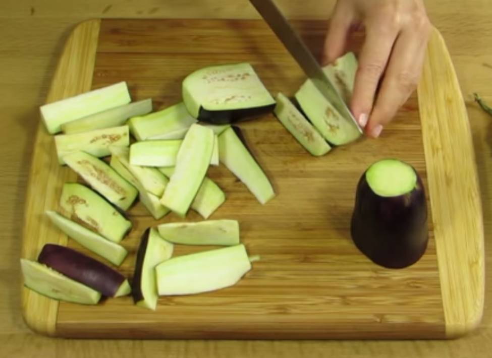 - Баклажаны вымойте, порежьте длинными слайсами, не очищая от кожицы. Вымочите овощи в подсоленной воде, промойте и дайте воде полностью стечь с них.