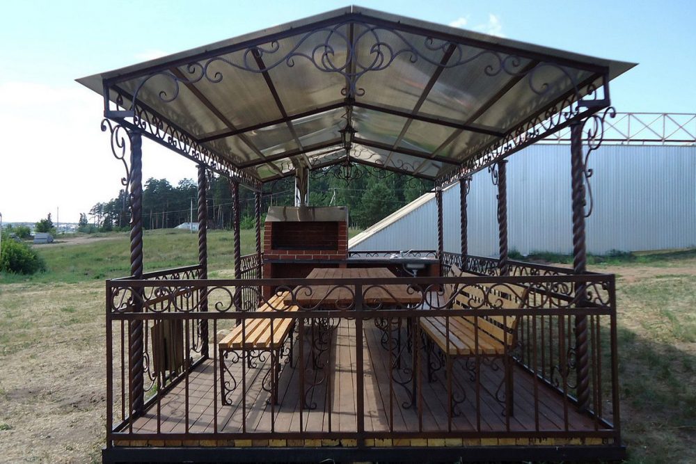 Для открытой конструкции можно вместо стен сделать небольшое ограждение или забор, украсив элементами ковки, а внутри установить стол с лавочками.