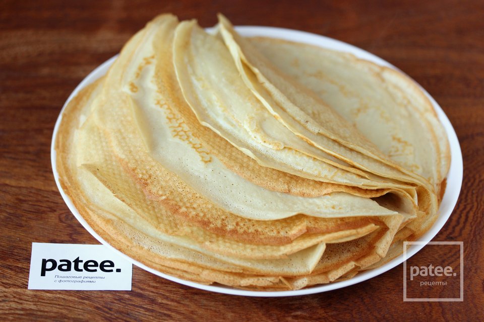 На сковороде большого диаметра, смазанной подсолнечным рафинированным маслом, жарим блинчики привычным образом (с двух сторон). Из предложенного в рецепте количества ингредиентов получается примерно 14-16 блинов.