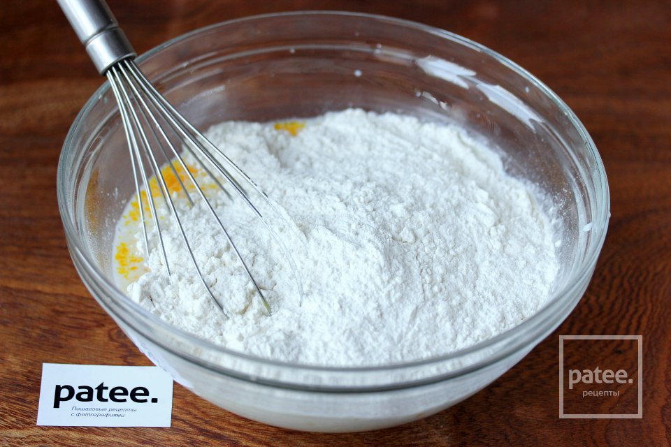 Всыпаем в молоко с яйцом пшеничную муку.