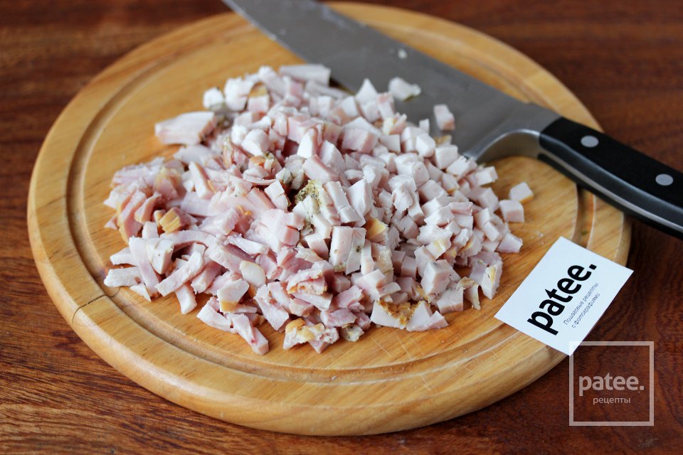 Блинчики готовы- приступаем к приготовлению начинки. Ветчину нарезаем мелкими кубиками.
