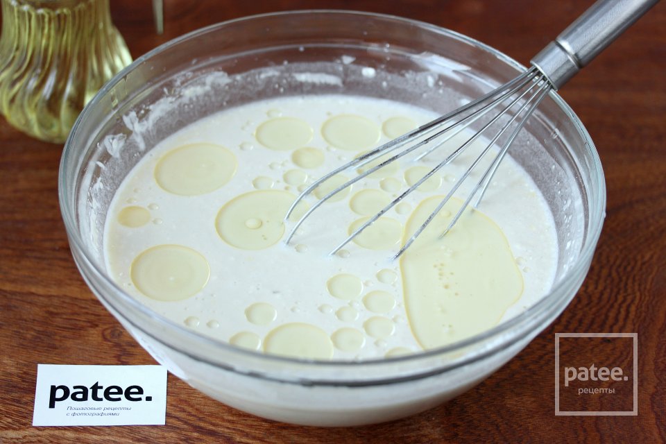В конце вмешиваем в блинное тесто подсолнечное рафинированное масло.