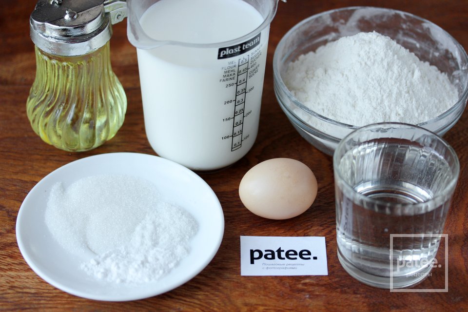 Для приготовления блинного теста нам понадобятся следующие ингредиенты: мука пшеничная, куриное яйцо, молоко, кипяток, масло подсолнечное рафинированное, соль, сахар, пищевая сода.
