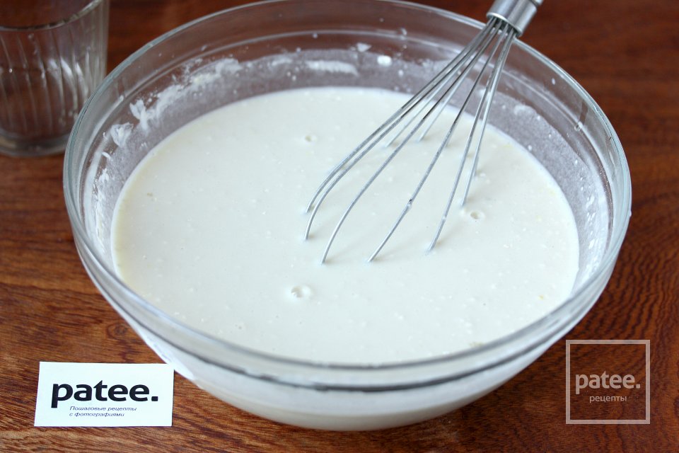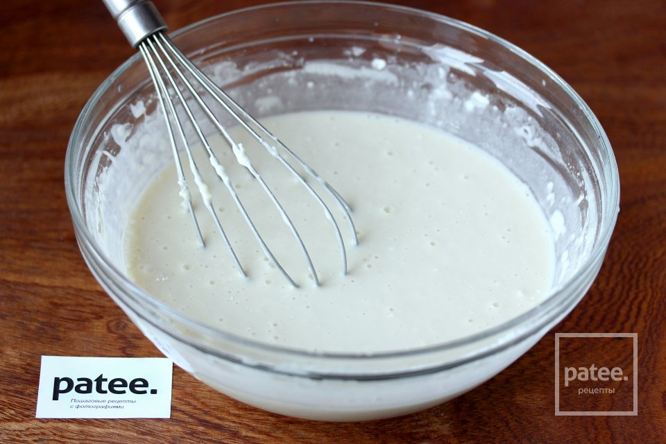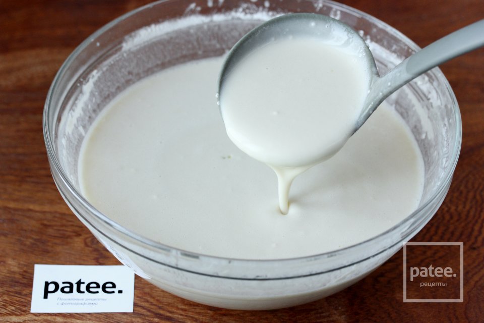 Готовое тесто не должно быть густым, оно должно литься- мы будем выпекать тонкие блинчики!