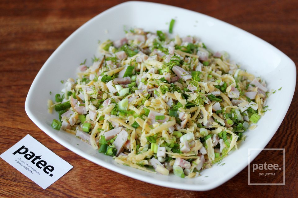 Чтобы не тратить время на блины, можно приготовить простой салат с колбасой и сыром.