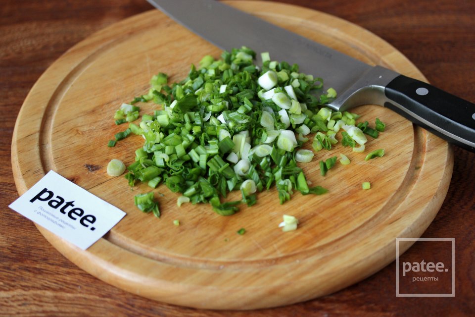 Зелёный лук моем, просушиваем и нарезаем перья тонкими колечками.