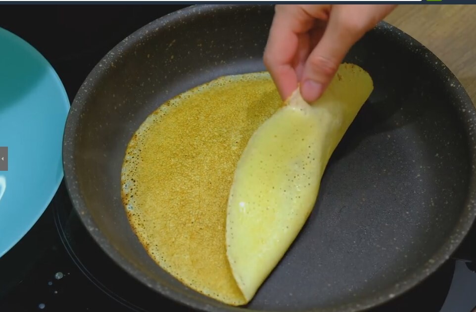 После того, как поверхность блинчика станет матовой, переверните его на другую сторону, и продолжайте поджаривать до готовности. В среднем, процесс жарки занимает 1 минуту с каждой стороны