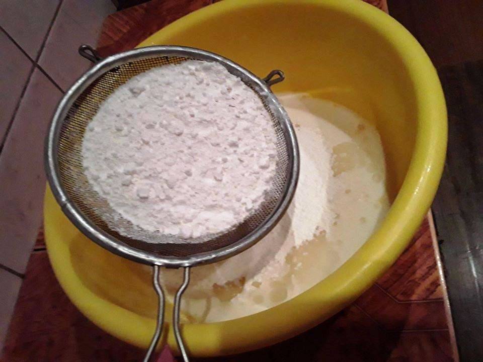 3. Муку обязательно просеять и также постепенно ввести в смесь. При этом постоянно мешая ее венчиком или миксером. Таким образом вмешать все необходимое количество. После замеса не должно остаться комочков. За этим надо внимательно следить. Эти комки сами не растворятся, и когда будете печь, они так и останутся на испеченной поверхности.