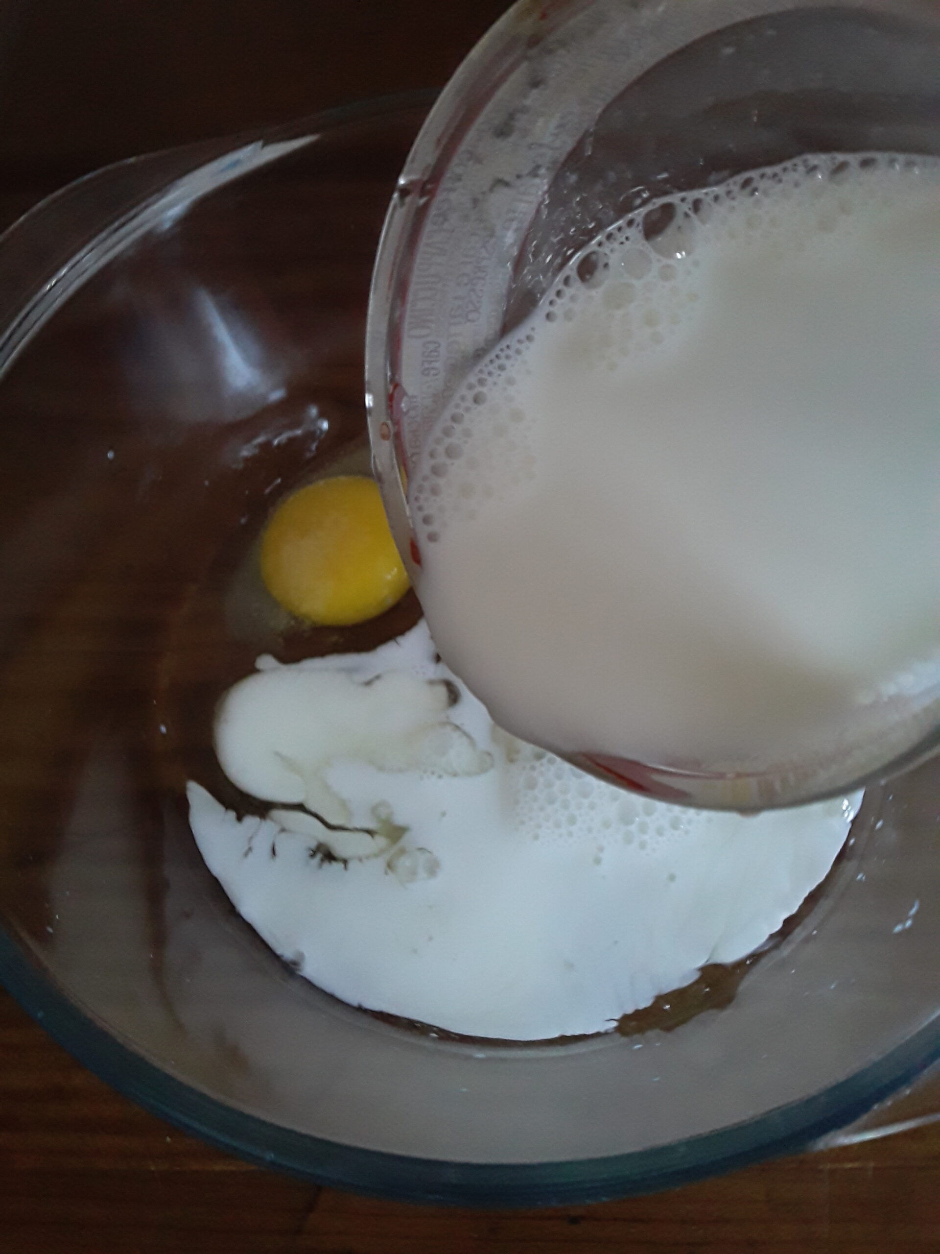 2. Кислое молоко также нужно заранее достать или немного согреть. Затем влить его в миску и снова перемешать венчиком, или миксером на средней скорости.