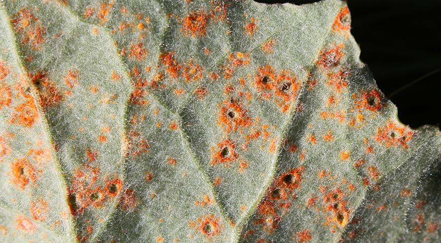 Проявляется заболевание наличием темно оранжевых пятен на верхней части листьев. Образуются споры грибка.