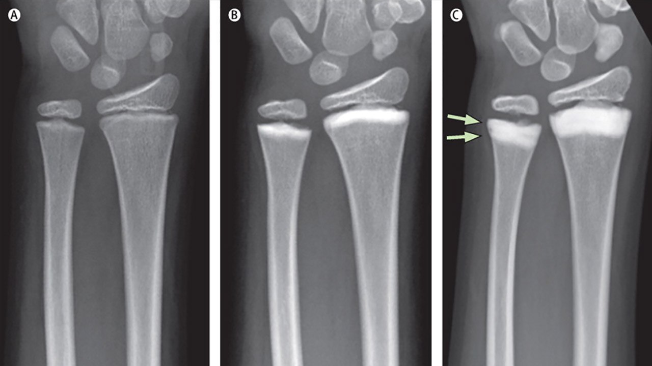 Рисунок 3. Рентгенограмма правого запястья. Развитие остеопороза (b, c) в ходе лечения с помощью человеческих моноклональных антител. Стрелками отмечены двухслойные склеротические полосы после двух курсов препарата. Источник : Elsevier Ltd/The Lancet