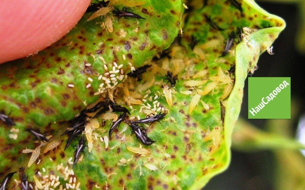 Питаются колонии соком растений, поэтому на листьях можно обнаружить небольшие пятна – следы укусов вредителей. Зараженные листья желтеют, деформируются и опадают, после чего насекомые перемещаются на стебли, цветки и завязи.