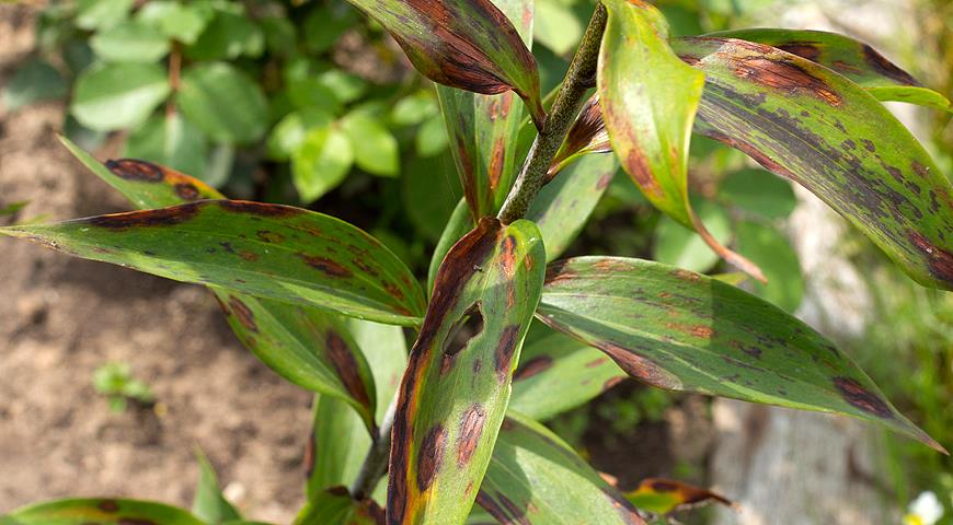 Поврежденные аскохитозом листья легко узнать по большим пятнам цвета охры. Они иссушают массу растения, разрушают его структуру. В результате ранее здоровые побеги начинают крошиться и преждевременно увядать.
