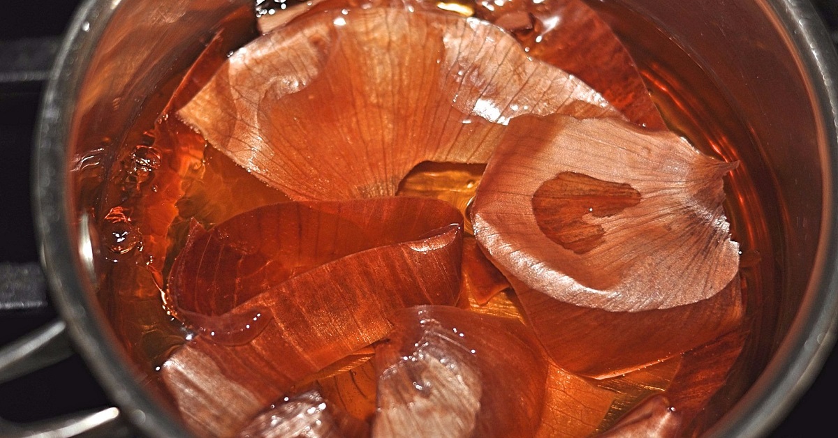 - Использовать отвар луковой шелухи. Снять с 1-2 крупных луковиц шелуху, залить кипятком и оставить настаиваться на 24 часа. Другой вариант приготовления – непосредственно варка. Шелуху оставляют в кипящей воде на слабом огне на 20-30 минут. Средство используют неразведенным, заливая его в пульверизатор.