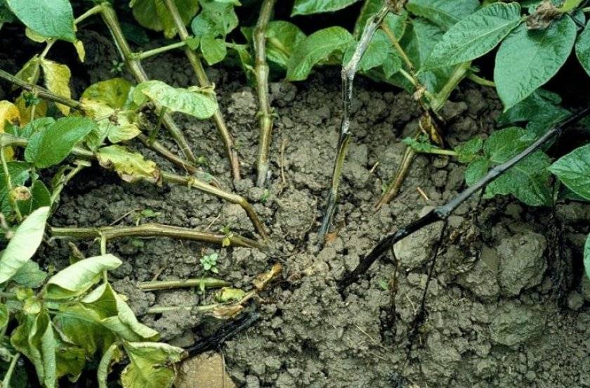 Пораженные черной ножкой кустики легко отрываются от корней, клубни на них не образуются. При инфицировании взрослых растений бактерии проникают из почвы в корни, столоны, а оттуда уже в формирующиеся клубни. Мякоть загнивает, трескается кожура, появляется жидкая слизь. Нередко распространителями болезни являются колорадские жуки.