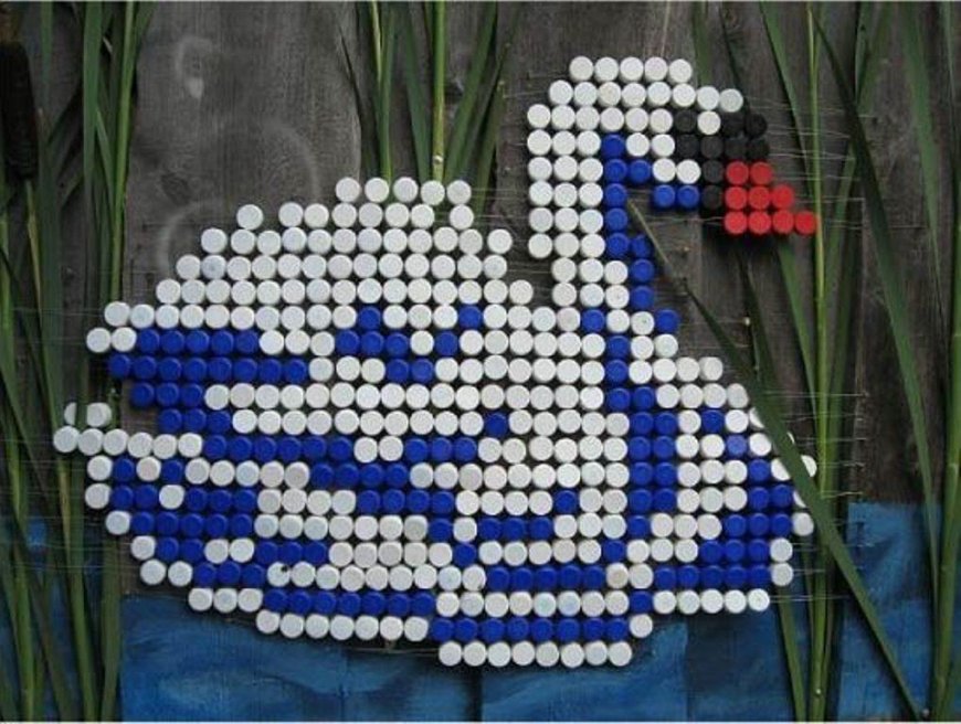 Крышки пластиковых бутылок, необходимо соединять вплотную друг к другу. Но в дальнейшем такое присоединение крышек создаст проблему чистки мозаики. В каждую крышку могут попасть грязь и пыль и их необходимо чистить тоже отдельно.