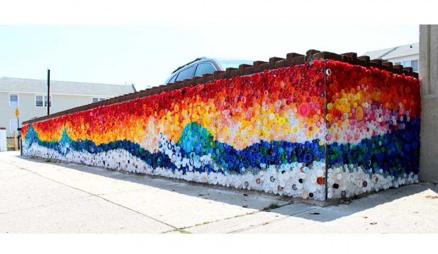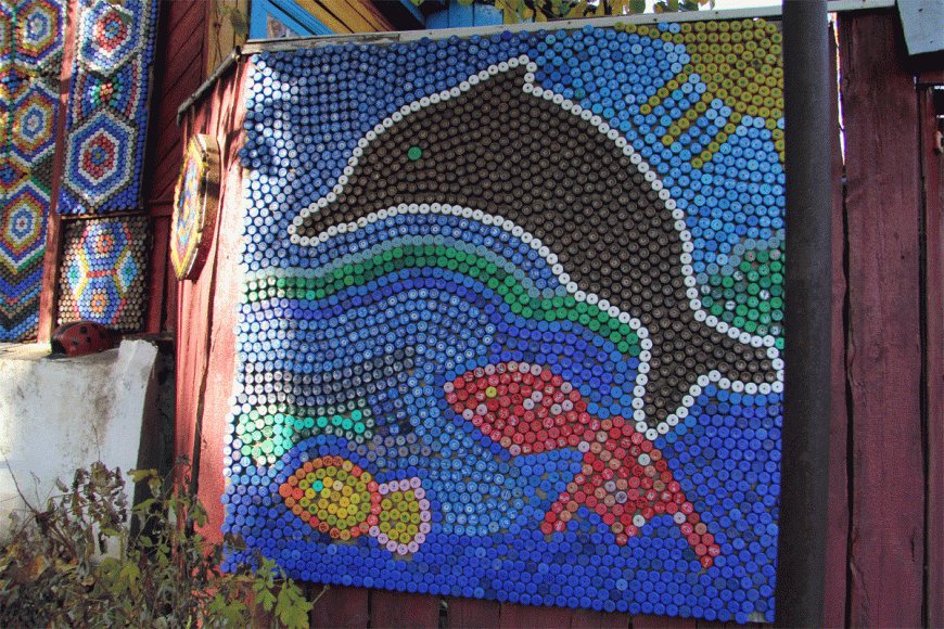 Создать мозаику из крышек от пластиковых бутылок, можно и не на доме или заборе, а например создать практичный коврик. Данная поделка может стать отличным массажным ковриком для спины, а также для ног.