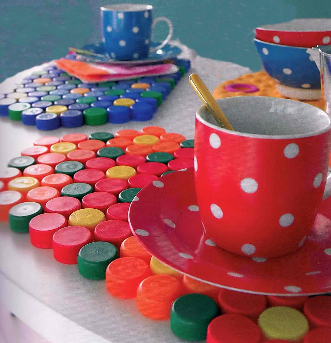 Несмотря на то, что пластик довольно чувствителен к воздействию высоких температур, коврики из крышек вполне могут использоваться как подставка под горячие блюда. Безусловно, огненные сковородки все не стоит размещать на ковриках, а вот чашка горячего чая или тарелка будут отлично чувствовать себя на такой подставке.