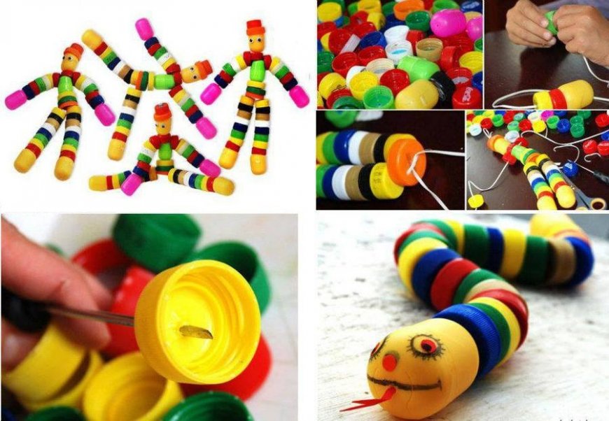 Из пластиковых пробок можно сделать маленькие игрушки. Для этого рисуется эскиз и, следуя нему, крышки склеиваются между собой с помощью супер клея. Одной из наиболее простых вариантов игрушки является гремучая змея.