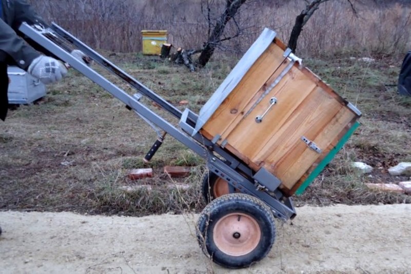 Тележка апилифт хорошо подходит для перевозки пчелиных ульев. Специальный механизм со шкивами и тросом помогает забрать груз с земли и переместить вверх, обеспечивая расположение его центра тяжести над осью колес.
