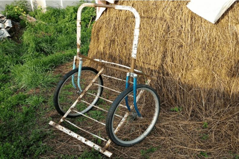 Эта конструкция предназначена для перевозки сена. Две вилки от велосипедов, пара колес и спинка от кровати – вполне реальные комплектующие в условиях села.