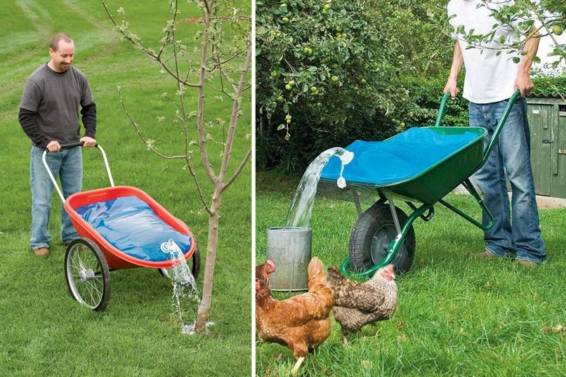 С помощью тачки можно доставить воду к удаленному огороду, дереву, домашней утвари. Перед нами фабричные варианты конструкций, однако специальный мешок для воды подойдет и для самодельной тачки.