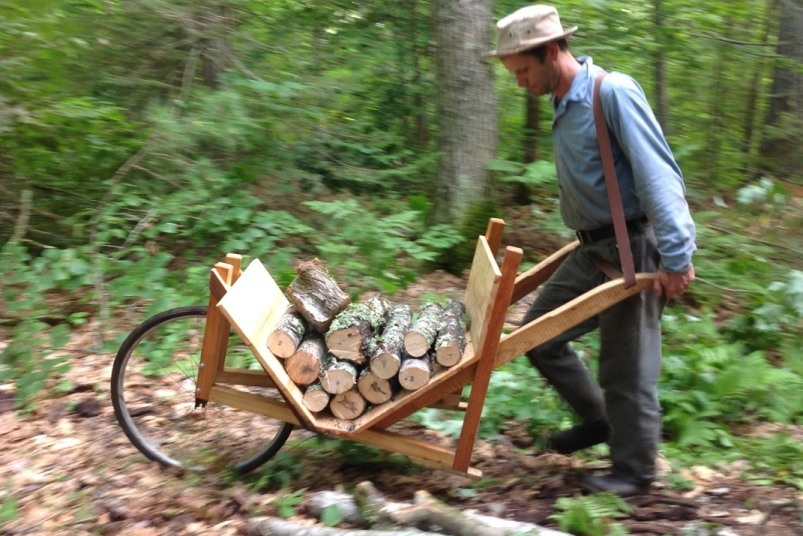 Эта тачка изготовлена своими руками специально для перевозки дров. Конструкция проста, и ее нетрудно повторить. Велосипедное колесо большого диаметра замечательно подходит к условиям леса. Однако половина груза вновь достается человеку.