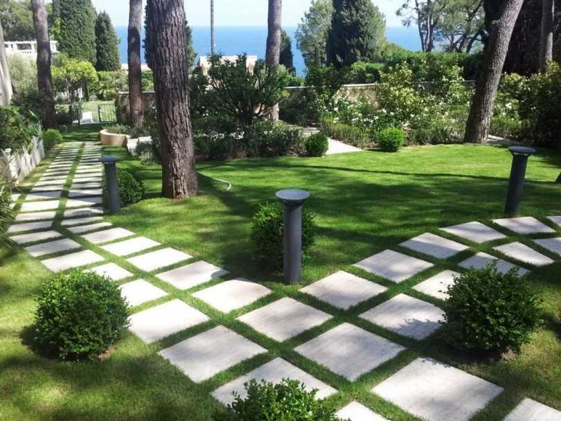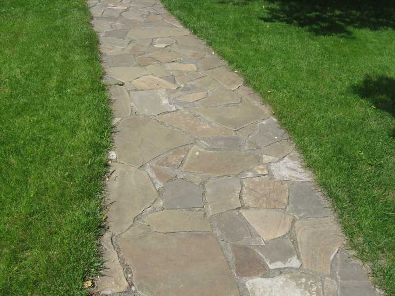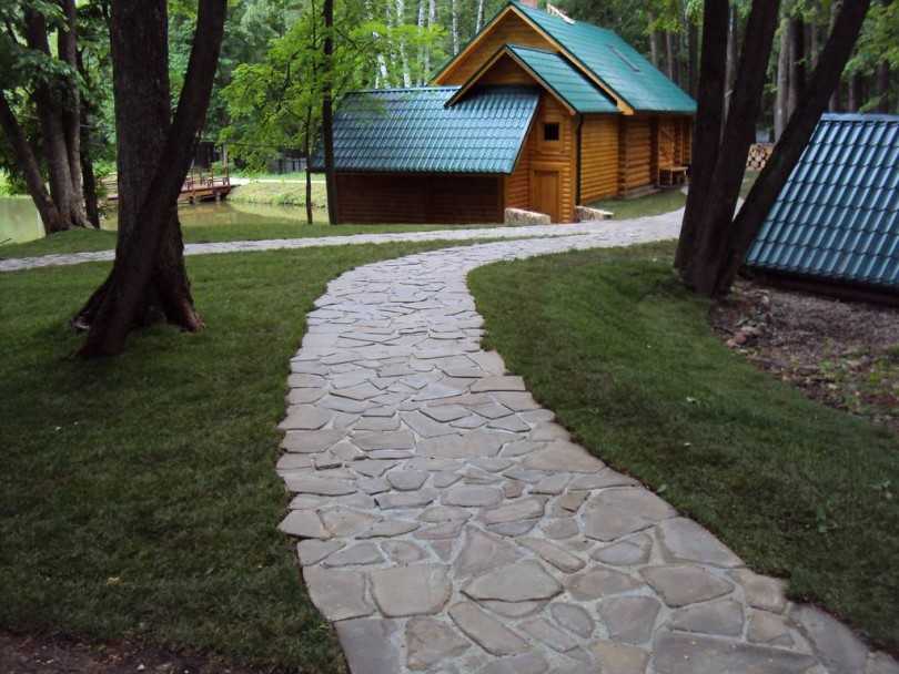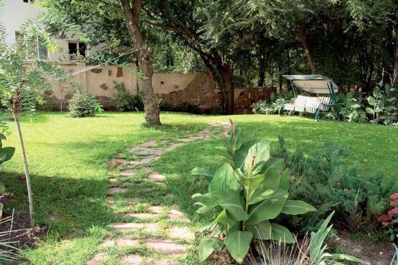 Садовые тропы из дикаря выкладывают только из камня, либо оставляют просвет между ними. В них высевают газонную траву.