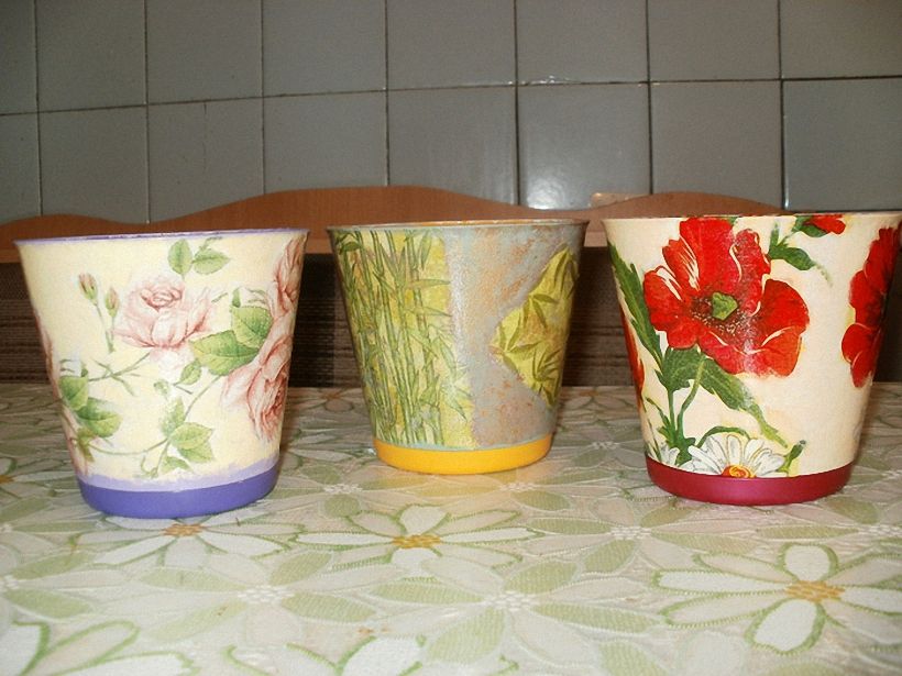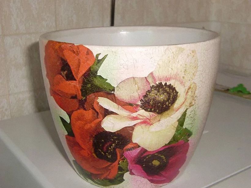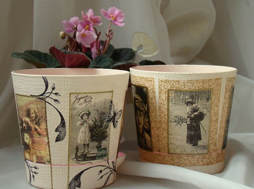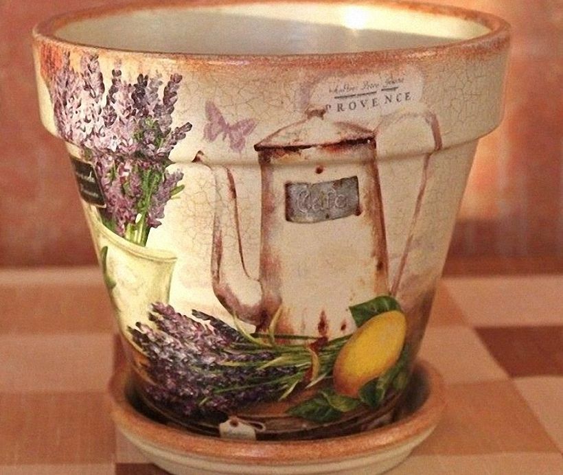 Техника, что позволяет перенести на поверхность горшка изображение с листа бумаги или салфетки. Для декорирования потребуется глиняный, стеклянный или керамический горшок в светлых тонах. Бумагу с картинкой или салфетку прикладывают к поверхности и аккуратно покрывают слоем клея, после чего изделие высушивают и покрывают бесцветным лаком.