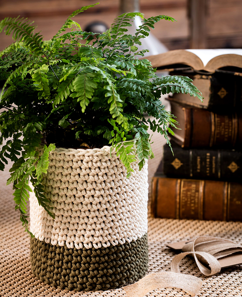 Техника сходна с оклеиванием: выбранный контейнер покрывают слоем лака ПВА, затем оплетают его плотными нитками разных расцветок. Используя бечевку, сизаль или шнуры можно добиться эффекта плетеной корзины.