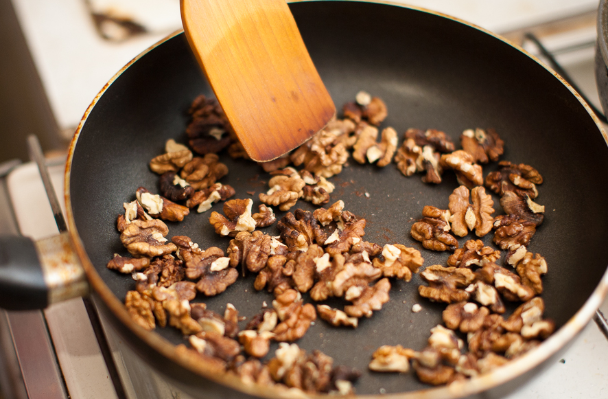Грецкие орехи измельчить на средние кусочки, после чего обжарить их на сухой сковороде. Достаточно пары минут, чтобы они приобрели золотистый цвет.