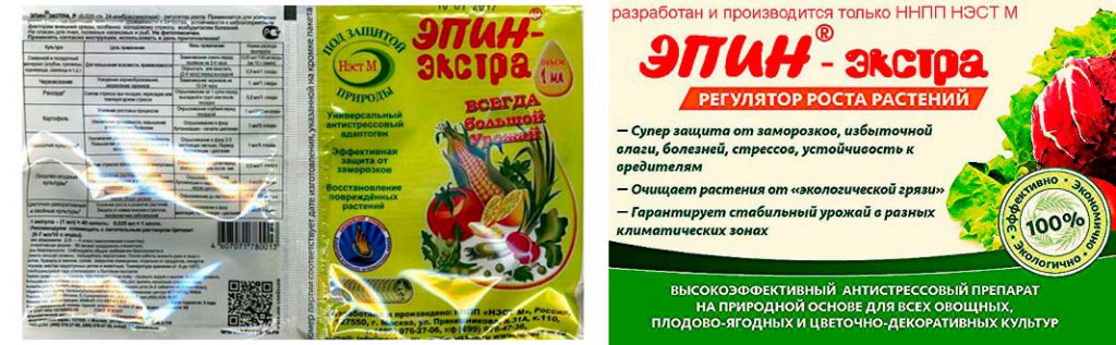 – Рассада – опрыскивание раствором Эпина-экстра (5-6 капель на 0,5 л воды) в фазе 2-3 настоящих листа и накануне пересадки;