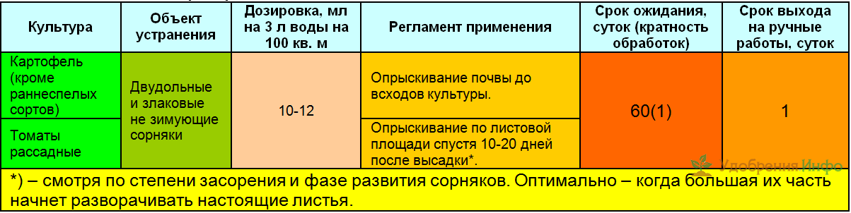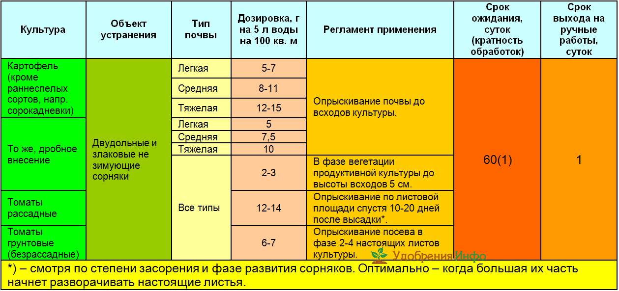 - Картофель. Опрыскивание сорной растительности до появления всходов: легкие почвы — 5-10 г на сотку (или 0,75 кг препарата на гектар), тяжелые почвы — 15 г на сотку (или 1 кг на гектар). Обработка по всходам — проводится когда высота ростка картофеля не > 5 см, количество препарата 8-9 г на сотку.