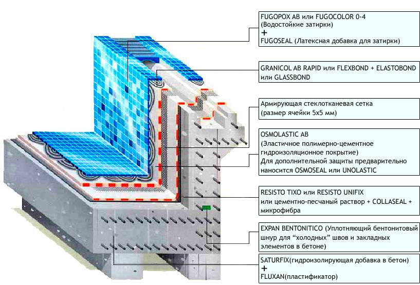 Гидроизоляция внутренней части бассейна должна быть выполнена в соответствии со следующими правилами:
