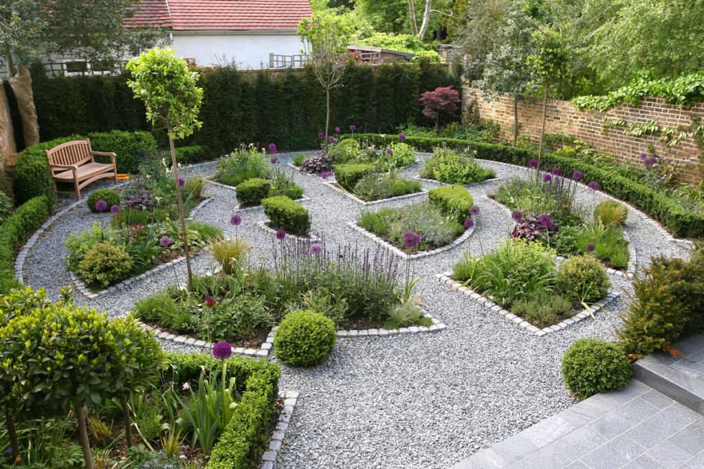 Существенно упростить задачу с оформлением садика поможет простой, но не менее привлекательный геометрический дизайн. Для этого достаточно среди гравийного покрытия оставить несколько квадратов, в которые затем будут высажены растения. Кстати, такая идея подойдет для стильного оформления огорода.