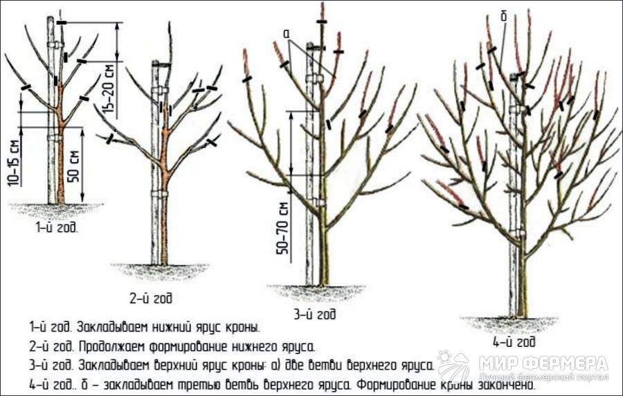 ![]() | Правило 1. Обрезать Обрезают ветви до момента распускания почек, но чтобы ночная температура воздуха не падала ниже ноля. Формируют ярусную крону или по типу Пальметта: