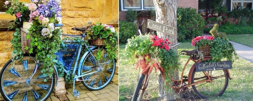 Интересным декоративным решением может быть велосипед, висящий на заборе, используемый в качестве полочки для цветочных горшков. От этой композиции веет романтикой и озорством, она проста в изготовлении и радует глаз.