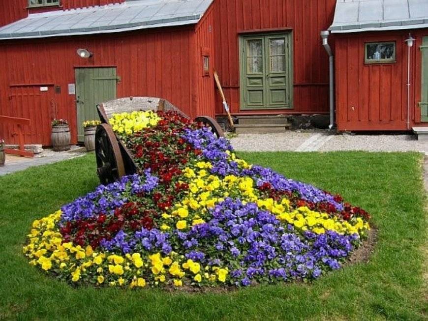 Оформление дачного участка невозможно без красивых клумб. Ваши цветочные композиции можно разнообразить добавлением старых емкостей: бочек, кастрюль, тележки. Сооружение оригинальных штакетников вокруг цветников сделает их затейливыми и интересными.