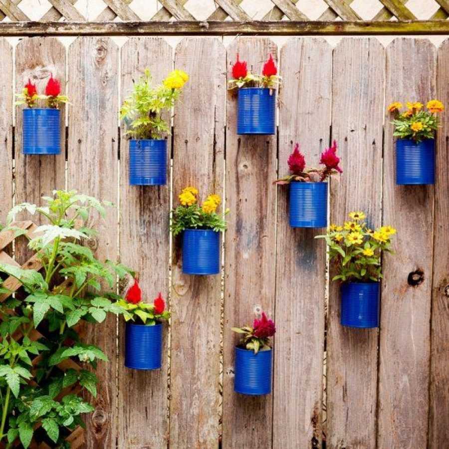 Сюда можно отнести «батарею» пластиковых бутылок, до половины наполненных землей, привязанных за горлышки к прочной палке (древку, карнизу, кронштейну), имеющих прорези для посадки и полива и служащих для проращивания рассады. Их можно расписать, а можно оставить в первозданном виде — даже так они выглядят вполне привлекательно.