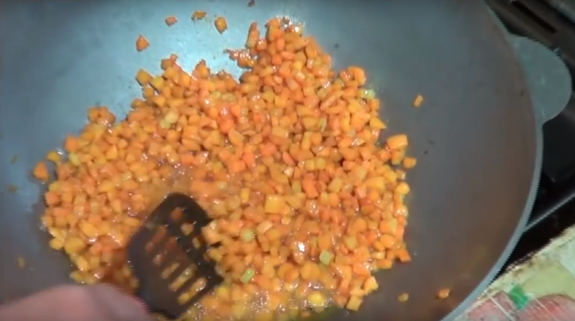 Сначала мелко нарезаем и обжариваем морковь до золотистого цвета на большом огне.