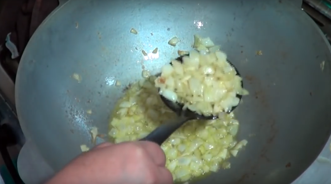 В глубокую сковороду наливаем масло и сильно разогреваем. Кладем лук, обжариваем до золотистого цвета.