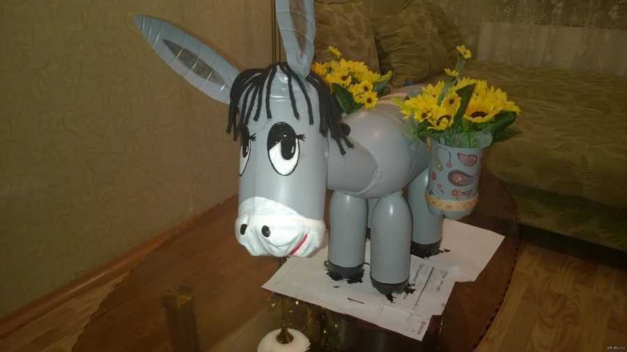 Бантик, выстриженный из обрезков, имеет отверстие, размер которого соответствует горлышку большой бутылки-туловища, к которому он и крепится, и фиксируется крышкой (это узелок бантика). Ослиный хвостик вставляется в прорезь в крышке.